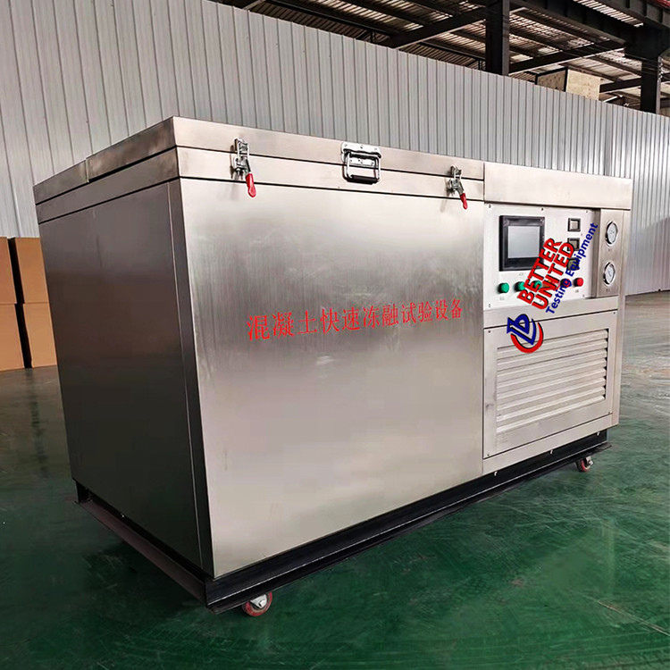 Dit apparaat is van toepassing op de vorstbestendigheidstest van beton met dynamische elasticiteitsmodulus, gewichtsverlies en relatieve duurzaamheidsindex als evaluatie-indexen.Dat wil zeggen, om de vorstbestendigheidsgraad van beton te bepalen door de weerstand van beton te meten onder de herhaalde werking van water en negatieve temperatuur, wordt een professionele snelvries- en dooitest uitgevoerd.De apparatuur gebruikt de methode van waterbevriezing en watersmelting.De standaard betonnen proefstukken worden in rubberen vaten geplaatst en gedrenkt in water.Vervolgens worden de rubberen vaten met de proefstukken en het water in de proefbox geplaatst.De waterlaag rond de proefstukken wordt periodiek bevroren en opgelost door het koelmiddel als circulatiemedium te gebruiken.